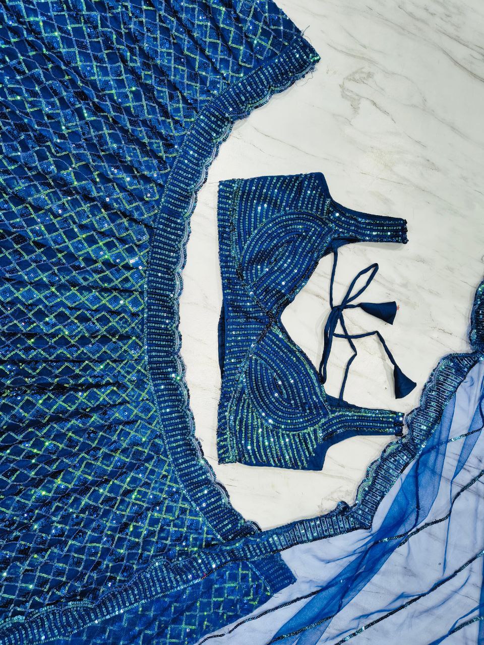 Blouse : *Premium Butterfly Net Embellished With Beautiful Heavy Zari Work With Beautiful Rainbow dual Sequins Work Both Side Work Front And Back With Work sleeves*( Unstitched )