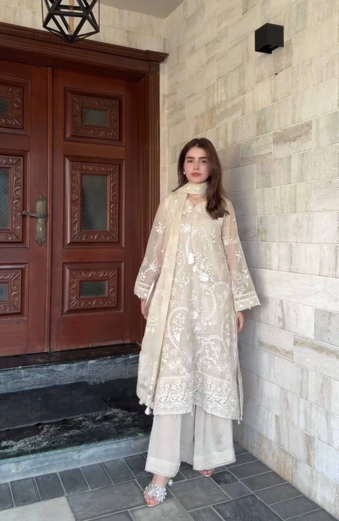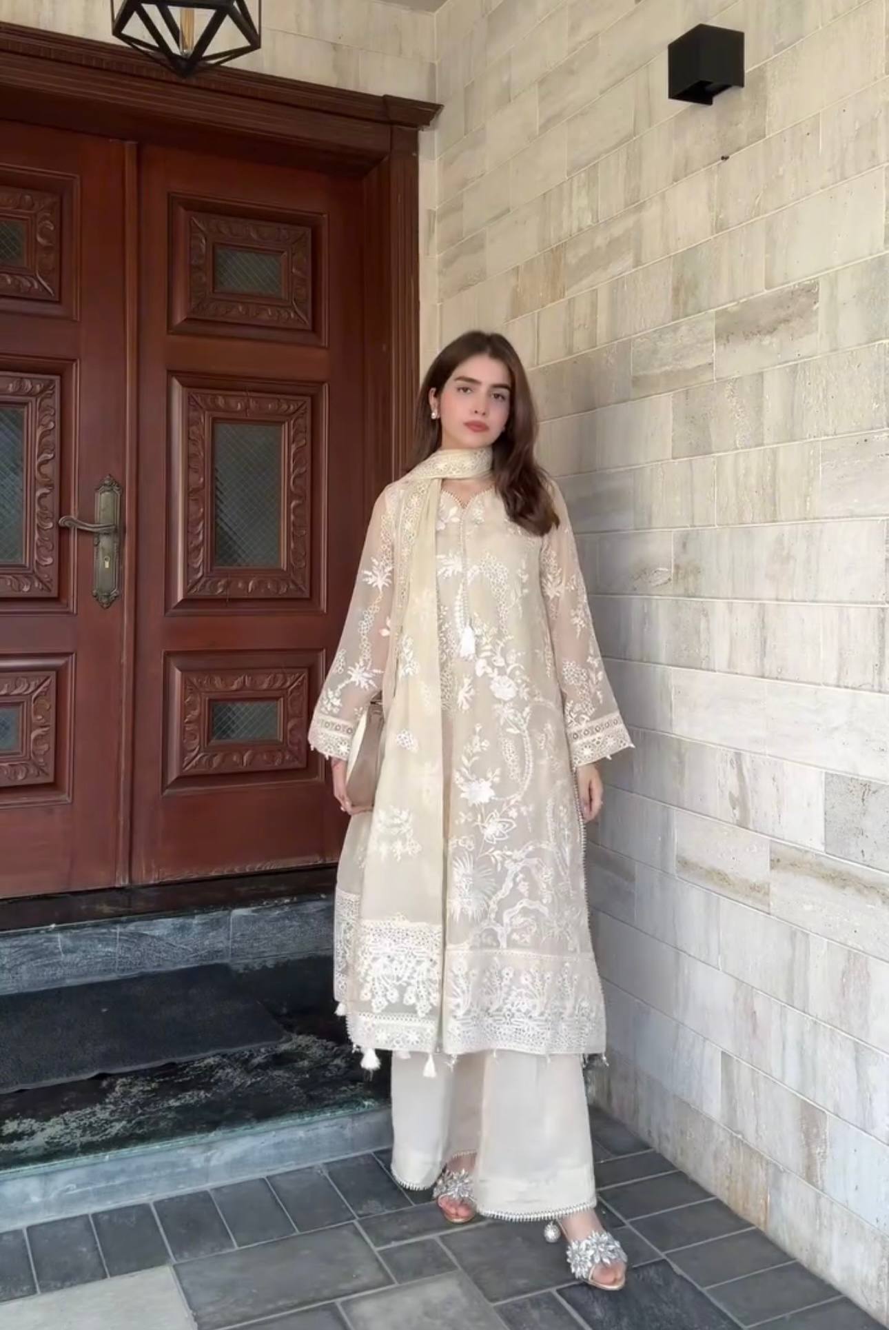 Amazing Off White Embroidered Georgette Palazzo Suit