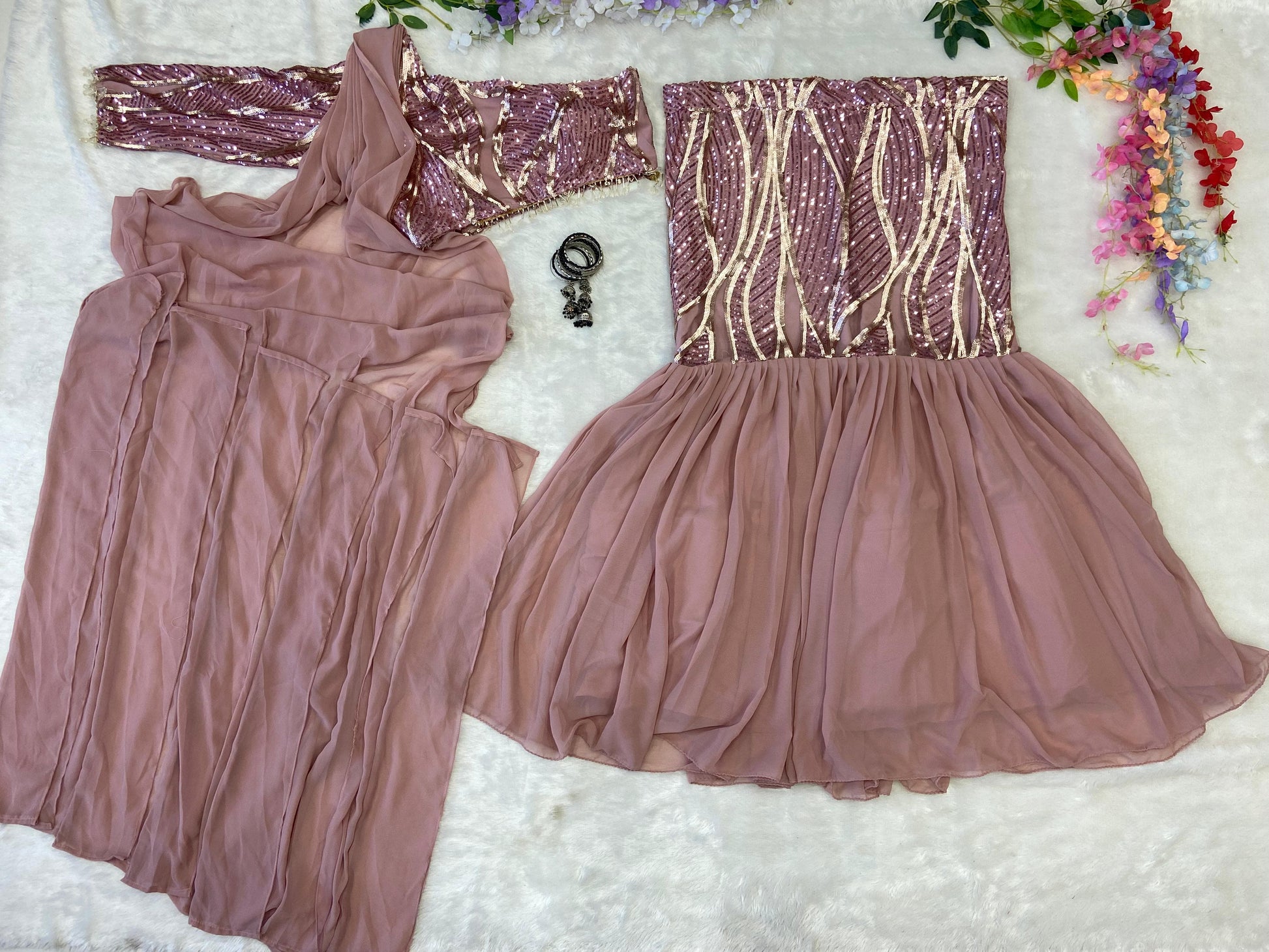 | Work | Beautiful Embroidery Sequins Work Both Side Work Front And Back With Attached Dupatta Of Heavy Georgette Ruffle Layers Dupatta 2.5 MTR |