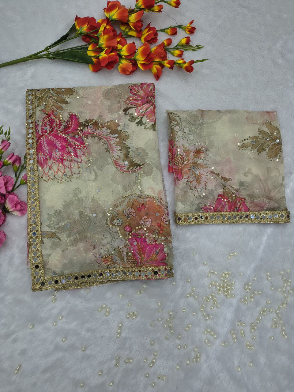 Blouse : Premium Tabby Silk with Beautiful Print, Handwork Sequins and Real Mirror Work (Unstitched 1 Mtr)