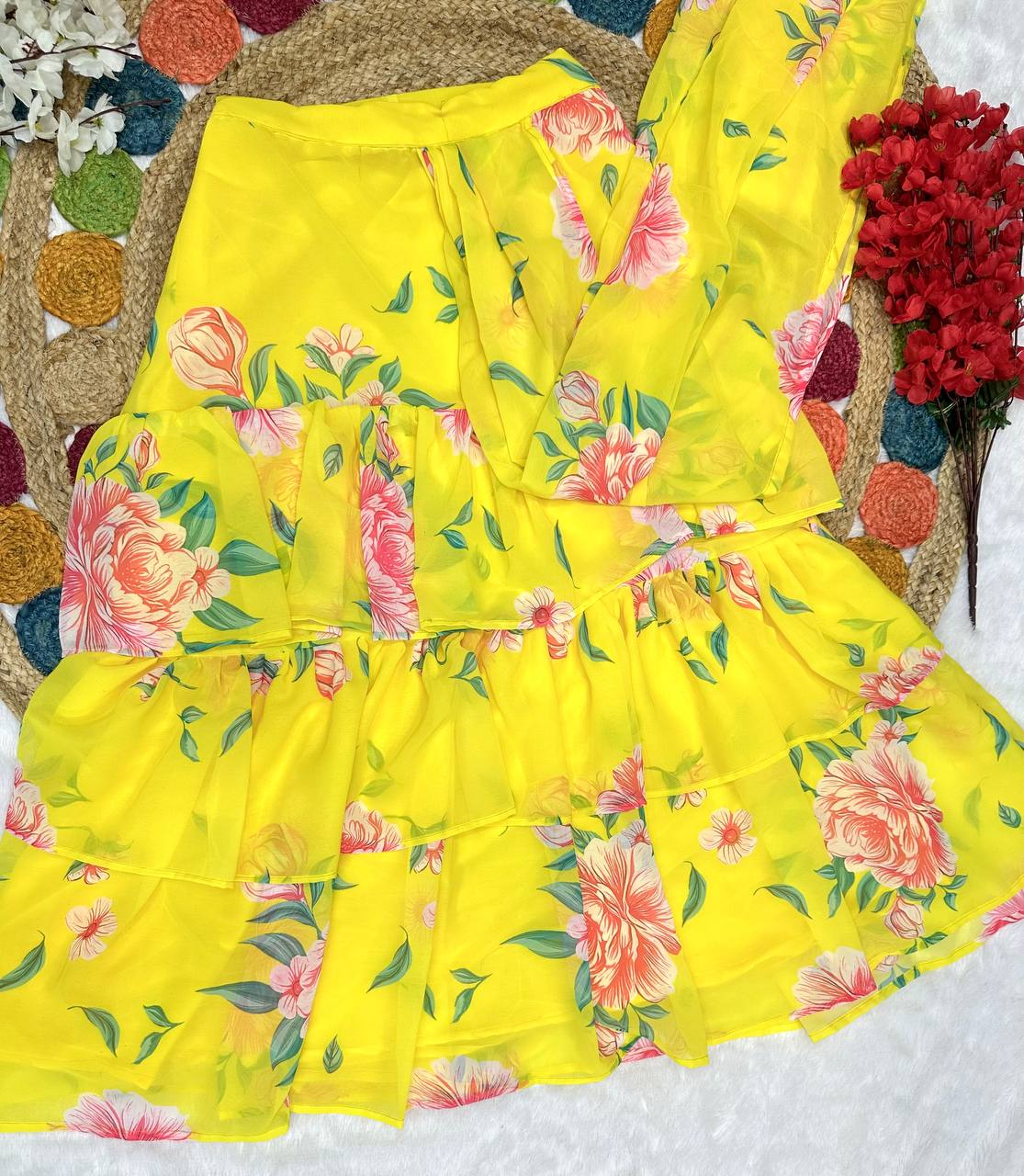 Dupatta/Pallu ;- Heavy Faux Georgette Ruffle & Digital Print With Attached Lehenga