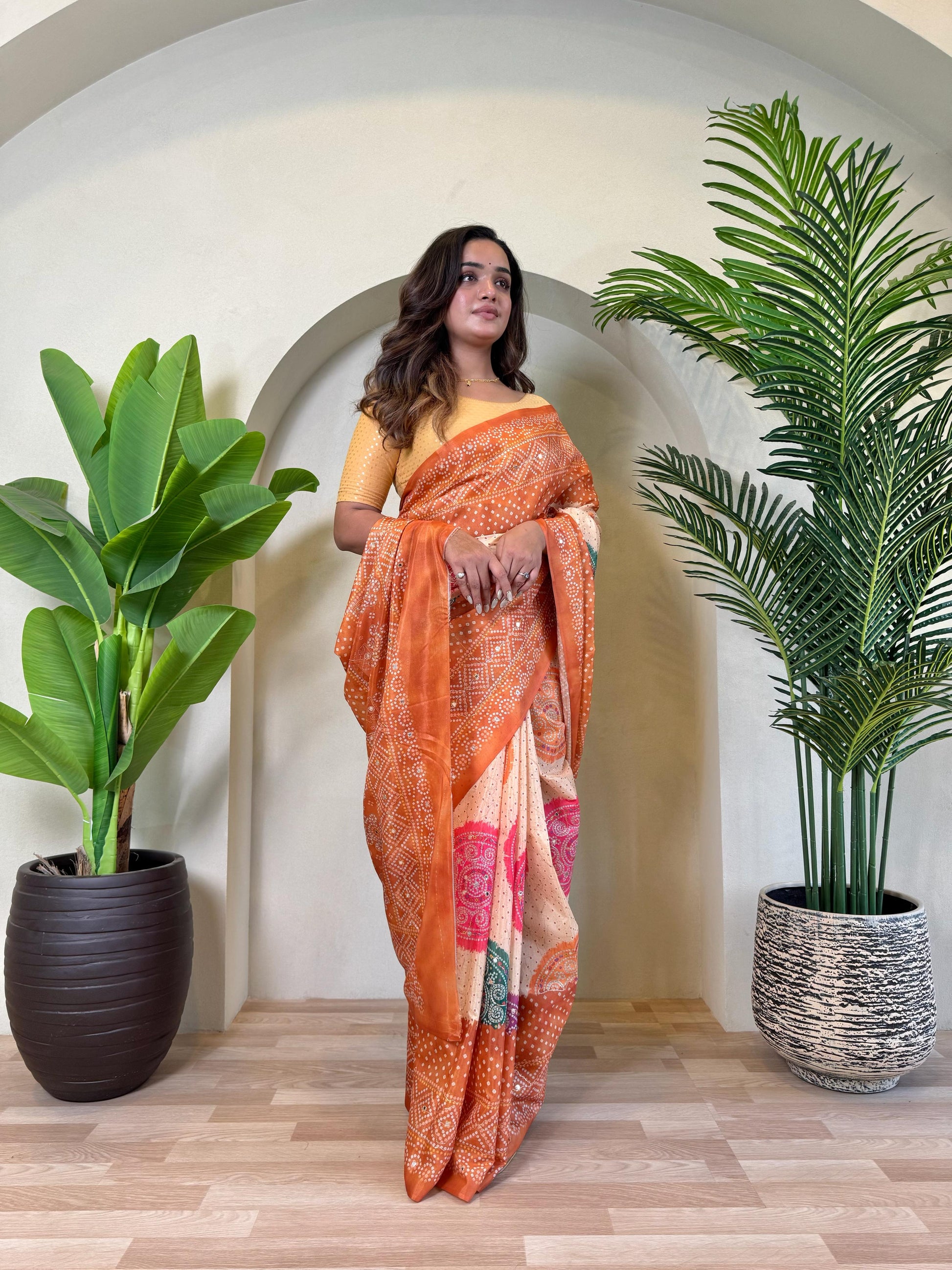 Multi Design Bandhani Print Orange Color Exclusive Saree